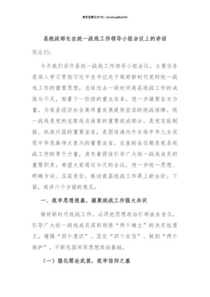 【七哥公文】2025年:【七哥公文】县统战部长在统一战线工作领导小组会议上的讲话+更多免费公文+VX:QiGeGongWen2024+更多免费公文+VX:QiGeGongWen2024