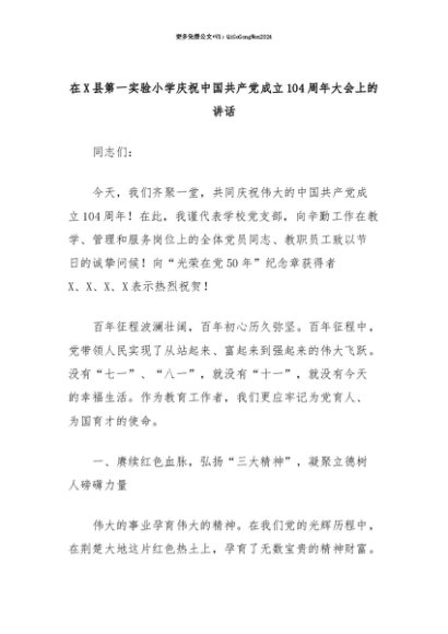 【七哥公文】2025年:【七哥公文】在县小学庆祝中国共产党成立104周年大会上的讲话+更多免费公文+VX:QiGeGongWen2024+更多免费公文+VX:QiGeGongWen2024