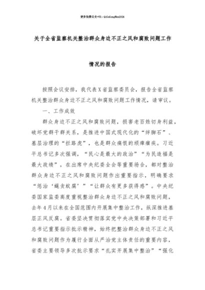 【七哥公文】2025年:【七哥公文】关于全省监察机关整治群众身边不正之风和腐败问题工作情况的报告+更多免费公文+VX:QiGeGongWen2024+更多免费公文+VX:QiGeGongWen2024