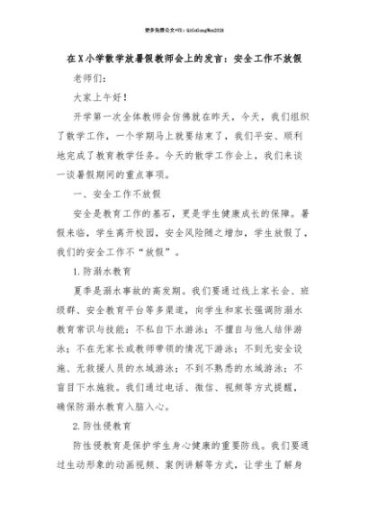 【七哥公文】2025年:【七哥公文】在X小学散学放暑假教师会上的发言:安全工作不放假+更多免费公文+VX:QiGeGongWen2024+更多免费公文+VX:QiGeGongWen2024