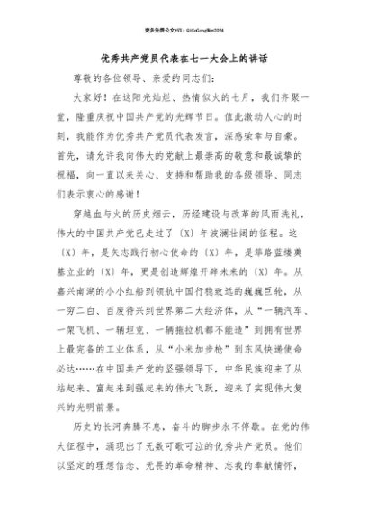 【七哥公文】2025年:【七哥公文】优秀共产党员代表在七一大会上的讲话+更多免费公文+VX:QiGeGongWen2024+更多免费公文+VX:QiGeGongWen2024