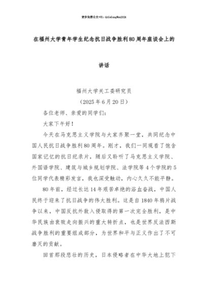 【七哥公文】2025年:【七哥公文】在福州大学青年学生纪念抗日战争胜利80周年座谈会上的讲话+更多免费公文+VX:QiGeGongWen2024+更多免费公文+VX:QiGeGongWen2024