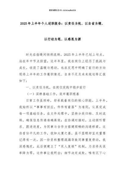 【七哥公文】2025年:【七哥公文】2025年上半年个人述职报告:以责任为帆、以自省为镜、以行动为笔、以感恩为源+更多免费公文+VX:QiGeGongWen2024+更多免费公文+VX:QiGeGongWen2024