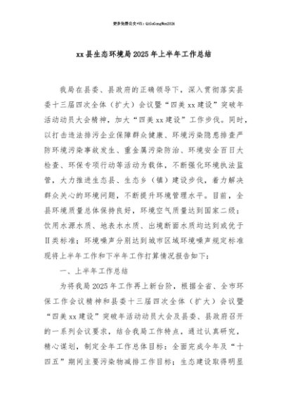【七哥公文】2025年:【七哥公文】xx县生态环境局2025年上半年工作总结+更多免费公文+VX:QiGeGongWen2024+更多免费公文+VX:QiGeGongWen2024