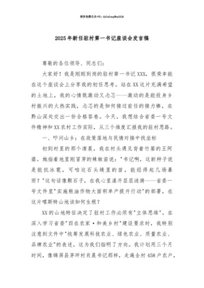 【七哥公文】2025年:【七哥公文】2025年新任驻村第一书记座谈会发言稿+更多免费公文+VX:QiGeGongWen2024+更多免费公文+VX:QiGeGongWen2024