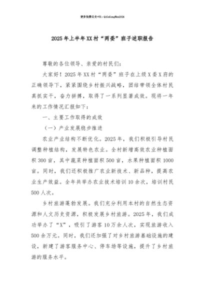 【七哥公文】2025年:【七哥公文】2025年上半年XX村“两委”班子述职报告+更多免费公文+VX:QiGeGongWen2024+更多免费公文+VX:QiGeGongWen2024