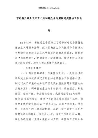 【七哥公文】2025年:【七哥公文】市纪委开展身边不正之风和群众身边腐败问题整治工作总结+更多免费公文+VX:QiGeGongWen2024+更多免费公文+VX:QiGeGongWen2024
