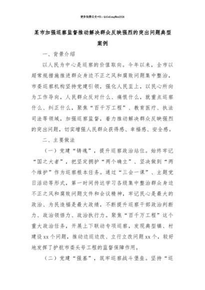 【七哥公文】2025年:【七哥公文】某市加强巡察监督推动解决群众反映强烈的突出问题典型案例+更多免费公文+VX:QiGeGongWen2024+更多免费公文+VX:QiGeGongWen2024