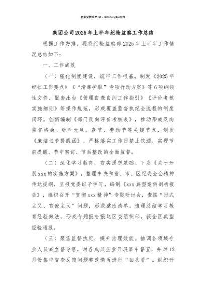 【七哥公文】2025年:【七哥公文】集团公司2025年上半年纪检监察工作总结+更多免费公文+VX:QiGeGongWen2024+更多免费公文+VX:QiGeGongWen2024