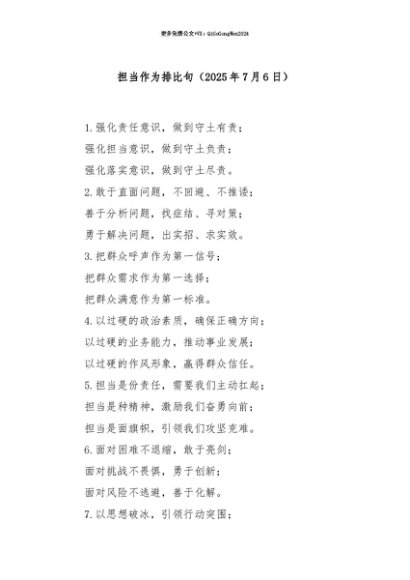 【七哥公文】2025年:【七哥公文】担当作为排比句(2025年7月6日)+更多免费公文+VX:QiGeGongWen2024+更多免费公文+VX:QiGeGongWen2024