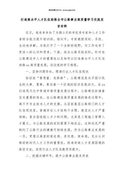 【七哥公文】2025年:【七哥公文】打造高水平人才队伍助推全市公路事业高质量学习交流发言材料+更多免费公文+VX:QiGeGongWen2024+更多免费公文+VX:QiGeGongWen2024