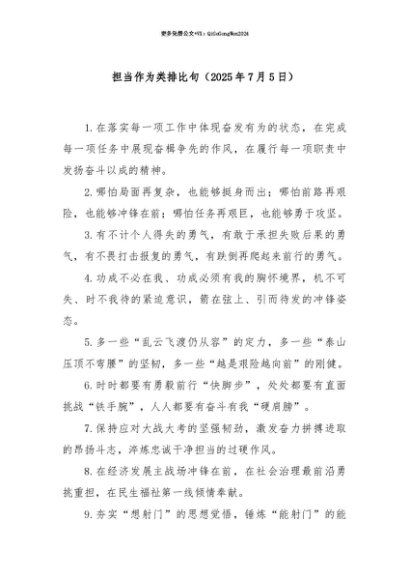 【七哥公文】2025年:【七哥公文】担当作为类排比句(2025年7月5日)+更多免费公文+VX:QiGeGongWen2024+更多免费公文+VX:QiGeGongWen2024