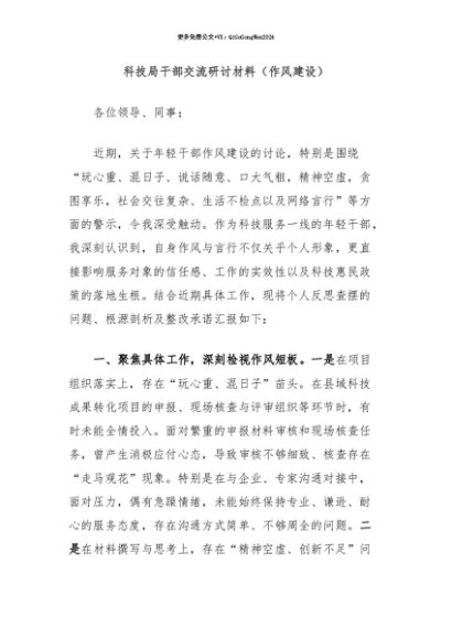 【七哥公文】2025年:【七哥公文】科技局干部交流研讨材料(作风建设)+更多免费公文+VX:QiGeGongWen2024+更多免费公文+VX:QiGeGongWen2024
