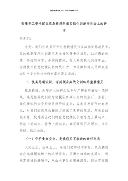 【七哥公文】2025年:【七哥公文】街道党工委书记在应急救援队伍实战化训练动员会上的讲话+更多免费公文+VX:QiGeGongWen2024+更多免费公文+VX:QiGeGongWen2024