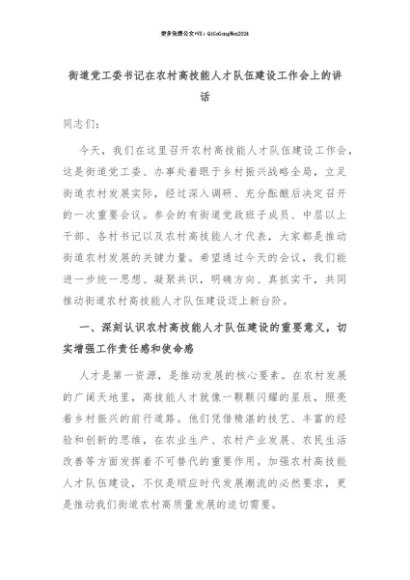 【七哥公文】2025年:【七哥公文】街道党工委书记在农村高技能人才队伍建设工作会上的讲话+更多免费公文+VX:QiGeGongWen2024+更多免费公文+VX:QiGeGongWen2024