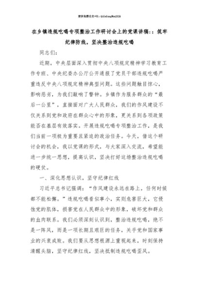 【七哥公文】2025年:【七哥公文】在乡镇违规吃喝专项整治工作研讨会上的党课讲稿:筑牢纪律防线,坚决整治违规吃喝+更多免费公文+VX:QiGeGongWen2024+更多免费公文+VX:QiGeGongWen2024