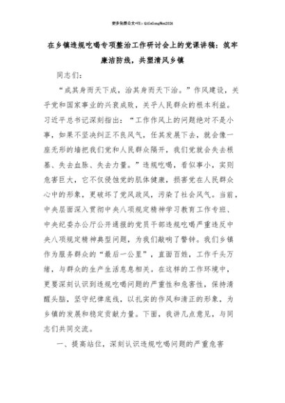 【七哥公文】2025年:【七哥公文】在乡镇违规吃喝专项整治工作研讨会上的党课讲稿:筑牢廉洁防线,共塑清风乡镇+更多免费公文+VX:QiGeGongWen2024+更多免费公文+VX:QiGeGongWen2024
