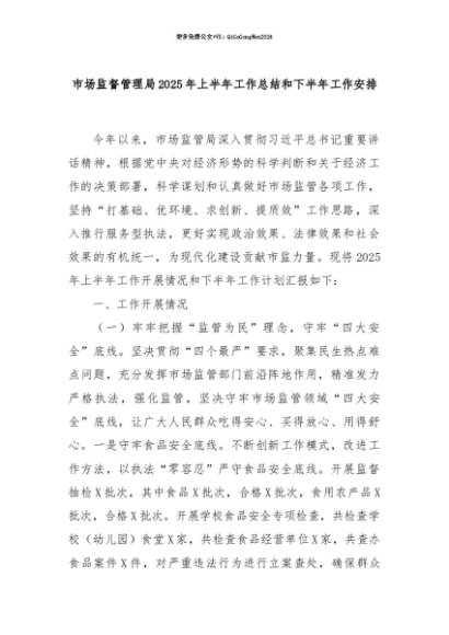 【七哥公文】2025年:【七哥公文】市场监督管理局2025年上半年工作总结和下半年工作安排+更多免费公文+VX:QiGeGongWen2024+更多免费公文+VX:QiGeGongWen2024