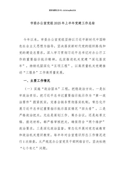 【七哥公文】2025年:【七哥公文】市委办公室党组2025年上半年党建工作总结+更多免费公文+VX:QiGeGongWen2024+更多免费公文+VX:QiGeGongWen2024