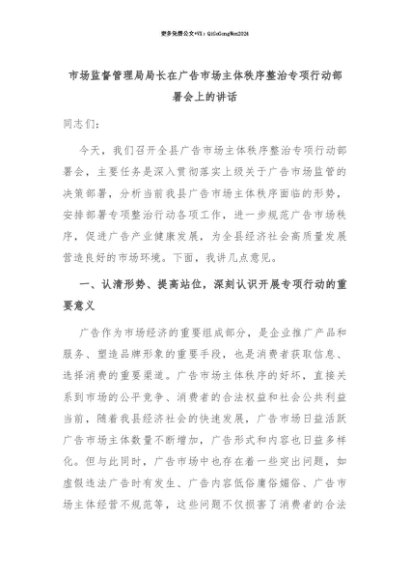【七哥公文】2025年:【七哥公文】市场监督管理局局长在广告市场主体秩序整治专项行动部署会上的讲话+更多免费公文+VX:QiGeGongWen2024+更多免费公文+VX:QiGeGongWen2024