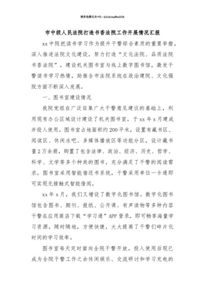 【七哥公文】2025年:【七哥公文】市中级人民法院打造书香法院工作开展情况汇报+更多免费公文+VX:QiGeGongWen2024+更多免费公文+VX:QiGeGongWen2024