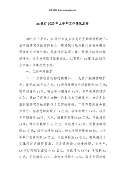 【七哥公文】2025年:【七哥公文】xx银行2025年上半年工作情况总结+更多免费公文+VX:QiGeGongWen2024+更多免费公文+VX:QiGeGongWen2024