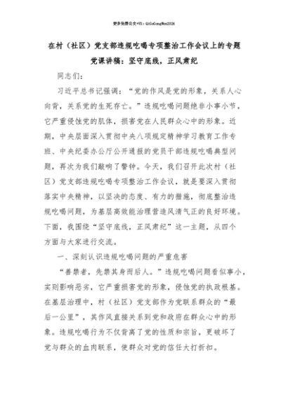 【七哥公文】2025年:【七哥公文】在村(社区)党支部违规吃喝专项整治工作会议上的专题党课讲稿:坚守底线,正风肃纪+更多免费公文+VX:QiGeGongWen2024+更多免费公文+VX:QiGeGongWen2024