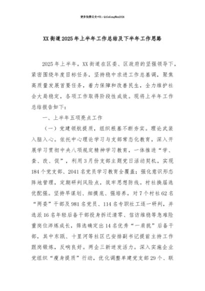 【七哥公文】2025年:【七哥公文】XX街道2025年上半年工作总结及下半年工作思路+更多免费公文+VX:QiGeGongWen2024+更多免费公文+VX:QiGeGongWen2024