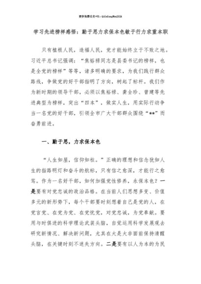 【七哥公文】2025年:【七哥公文】学习先进榜样感悟:勤于思力求保本色敏于行力求重本职+更多免费公文+VX:QiGeGongWen2024+更多免费公文+VX:QiGeGongWen2024