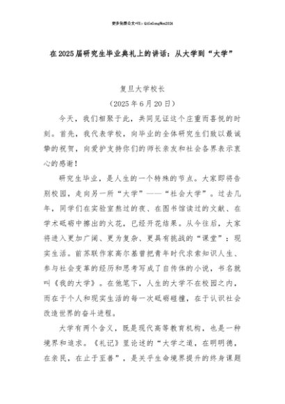 【七哥公文】2025年:【七哥公文】在2025届研究生毕业典礼上的讲话:从大学到“大学”+更多免费公文+VX:QiGeGongWen2024+更多免费公文+VX:QiGeGongWen2024