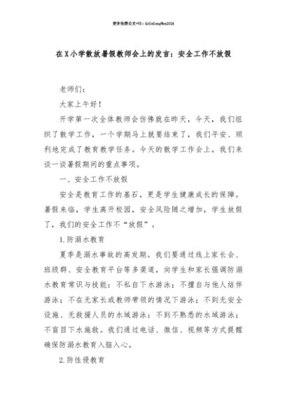 【七哥公文】2025年:【七哥公文】在X小学散放暑假教师会上的发言:安全工作不放假+更多免费公文+VX:QiGeGongWen2024+更多免费公文+VX:QiGeGongWen2024