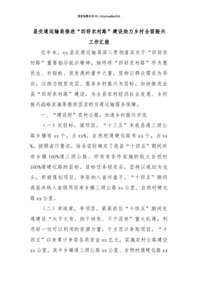 【七哥公文】2025年:【七哥公文】县交通运输局推进“四好农村路”建设助力乡村全面振兴工作汇报+更多免费公文+VX:QiGeGongWen2024+更多免费公文+VX:QiGeGongWen2024