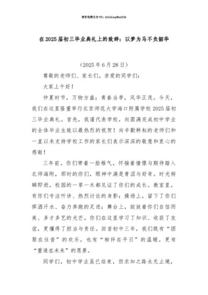【七哥公文】2025年:【七哥公文】在2025届初三毕业典礼上的致辞:以梦为马不负韶华+更多免费公文+VX:QiGeGongWen2024+更多免费公文+VX:QiGeGongWen2024