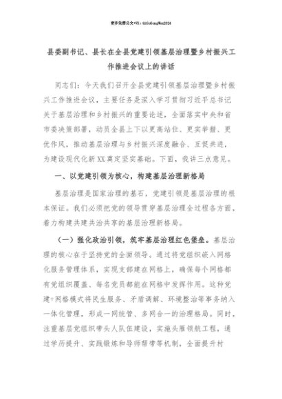 【七哥公文】2025年:【七哥公文】县委副书记、县长在全县党建引领基层治理暨乡村振兴工作推进会议上的讲话+更多免费公文+VX:QiGeGongWen2024+更多免费公文+VX:QiGeGongWen2024