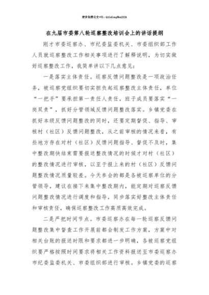 【七哥公文】2025年:【七哥公文】在九届市委第八轮巡察整改培训会上的讲话提纲+更多免费公文+VX:QiGeGongWen2024+更多免费公文+VX:QiGeGongWen2024