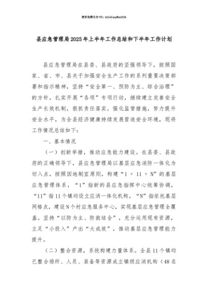 【七哥公文】2025年:【七哥公文】县应急管理局2025年上半年工作总结和下半年工作计划+更多免费公文+VX:QiGeGongWen2024+更多免费公文+VX:QiGeGongWen2024