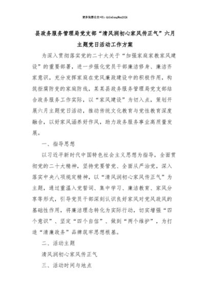 【七哥公文】2025年:【七哥公文】县政务服务管理局党支部“清风润初心家风传正气”六月主题党日活动工作方案+更多免费公文+VX:QiGeGongWen2024+更多免费公文+VX:QiGeGongWen2024