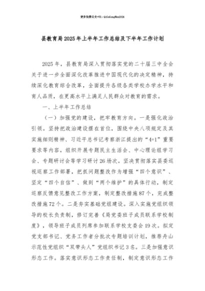 【七哥公文】2025年:【七哥公文】县教育局2025年上半年工作总结及下半年工作计划+更多免费公文+VX:QiGeGongWen2024+更多免费公文+VX:QiGeGongWen2024