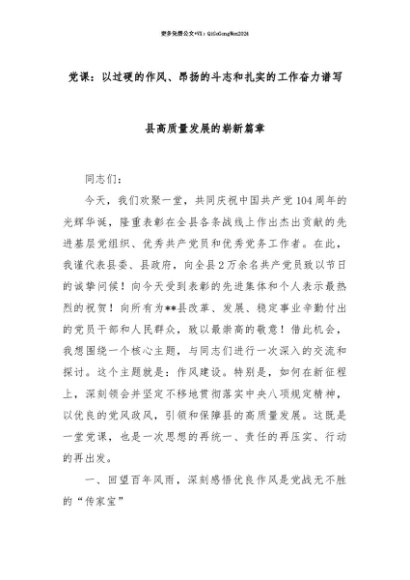 【七哥公文】2025年:【七哥公文】党课:以过硬的作风、昂扬的斗志和扎实的工作奋力谱写县高质量发展的崭新篇章+更多免费公文+VX:QiGeGongWen2024+更多免费公文+VX:QiGeGongWen2024