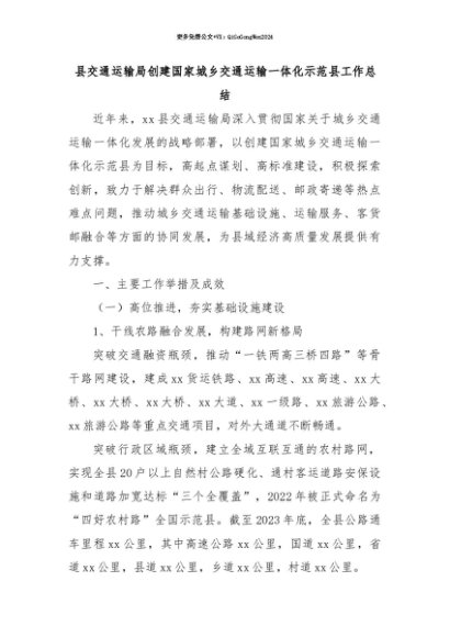 【七哥公文】2025年:【七哥公文】县交通运输局创建国家城乡交通运输一体化示范县工作总结+更多免费公文+VX:QiGeGongWen2024+更多免费公文+VX:QiGeGongWen2024