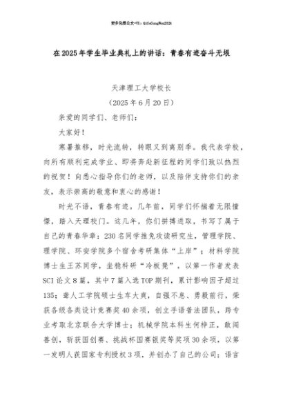 【七哥公文】2025年:【七哥公文】在2025年学生毕业典礼上的讲话:青春有迹奋斗无垠+更多免费公文+VX:QiGeGongWen2024+更多免费公文+VX:QiGeGongWen2024