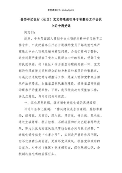 【七哥公文】2025年:【七哥公文】县委书记在村(社区)党支部违规吃喝专项整治工作会议上的专题党课+更多免费公文+VX:QiGeGongWen2024+更多免费公文+VX:QiGeGongWen2024