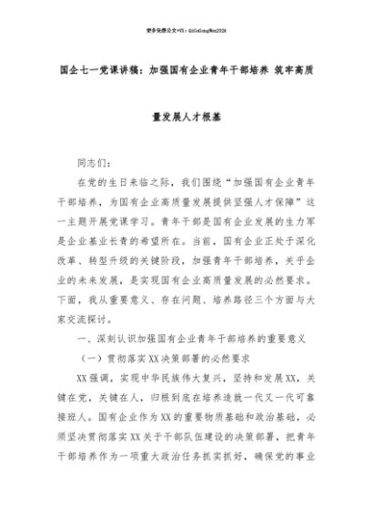 【七哥公文】2025年:【七哥公文】国企七一党课讲稿:加强国有企业青年干部培养 筑牢高质量发展人才根基+更多免费公文+VX:QiGeGongWen2024+更多免费公文+VX:QiGeGongWen2024
