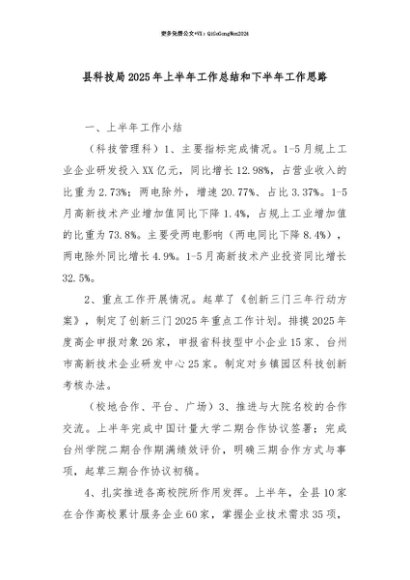 【七哥公文】2025年:【七哥公文】县科技局2025年上半年工作总结和下半年工作思路+更多免费公文+VX:QiGeGongWen2024+更多免费公文+VX:QiGeGongWen2024