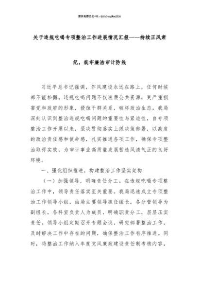 【七哥公文】2025年:【七哥公文】关于违规吃喝专项整治工作进展情况汇报——持续正风肃纪,筑牢廉洁审计防线+更多免费公文+VX:QiGeGongWen2024+更多免费公文+VX:QiGeGongWen2024