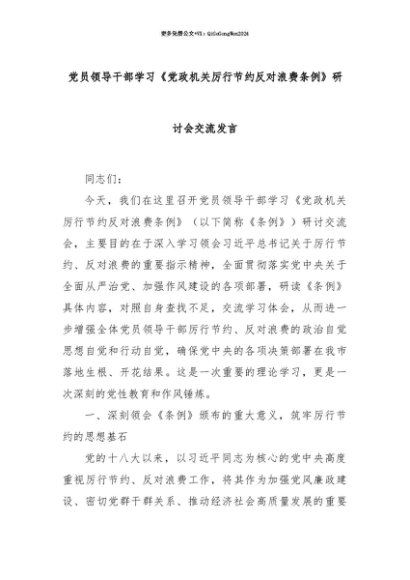 【七哥公文】2025年:【七哥公文】党员领导干部学习《党政机关厉行节约反对浪费条例》研讨会交流发言+更多免费公文+VX:QiGeGongWen2024+更多免费公文+VX:QiGeGongWen2024