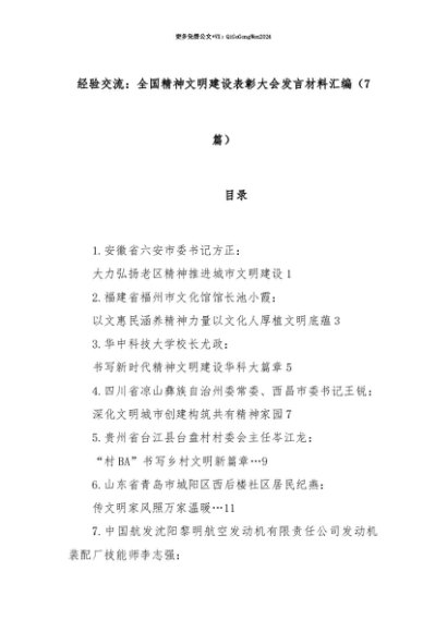 【七哥公文】2025年:【七哥公文】(7篇)经验交流:全国精神文明建设表彰大会发言材料汇编+更多免费公文+VX:QiGeGongWen2024+更多免费公文+VX:QiGeGongWen2024