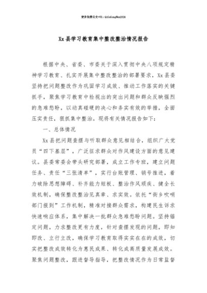 【七哥公文】2025年:【七哥公文】Xx县学习教育集中整改整治情况报告+更多免费公文+VX:QiGeGongWen2024+更多免费公文+VX:QiGeGongWen2024
