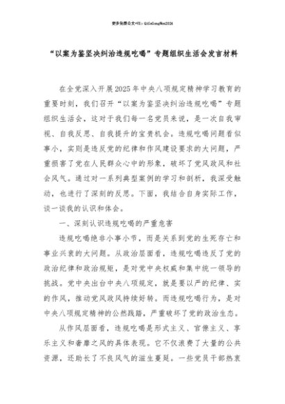 【七哥公文】2025年:【七哥公文】“以案为鉴坚决纠治违规吃喝”专题组织生活会发言材料+更多免费公文+VX:QiGeGongWen2024+更多免费公文+VX:QiGeGongWen2024