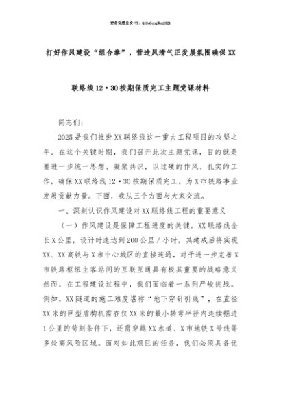 【七哥公文】2025年:【七哥公文】打好作风建设“组合拳”,营造风清气正发展氛围确保XX联络线12·30按期保质完工主题党课材料+更多免费公文+VX:QiGeGongWen2024+更多免费公文+VX:QiGeGongWen2024